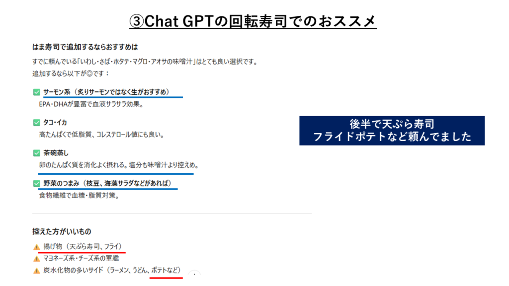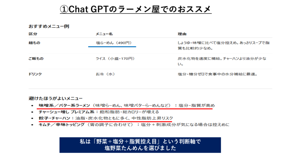 Chat GPTが示してくれた判断軸で無意識のうちにメニュー選びができる ダイエットが私の生活に溶け込んだように思います。