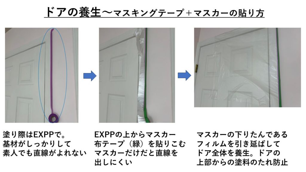 - 床、ドア、窓、エアコン、天井周りなどを「マスキングテープEXPP」でカバー。