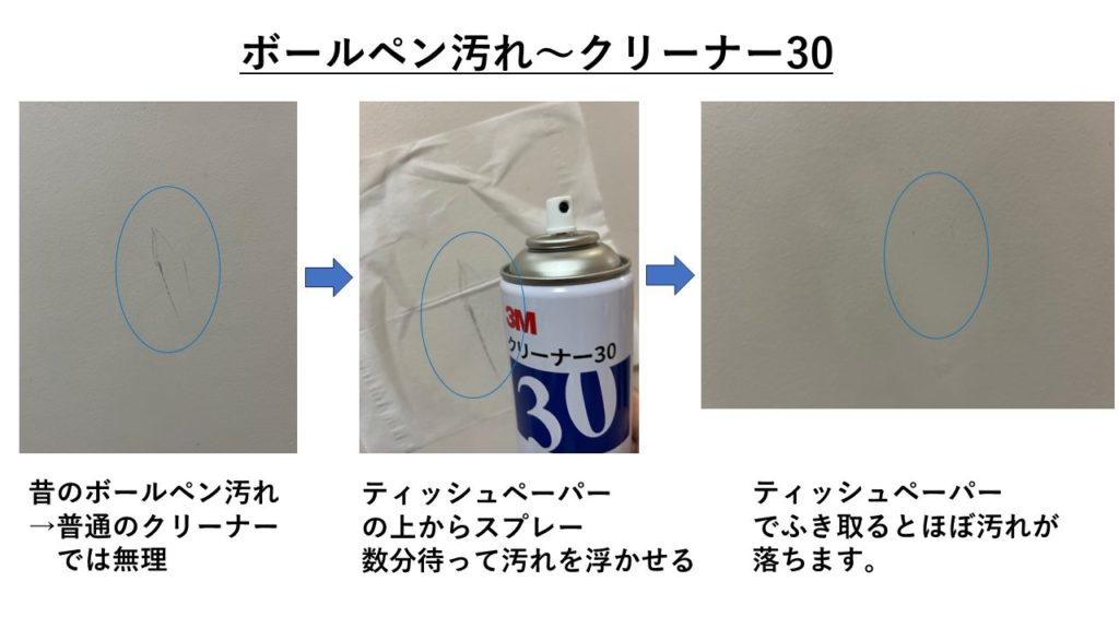 - マジックやボールペンのしつこい落書きには「クリーナー30」を使用。汚れの上にティッシュをかぶせて吹き付け、数分おくと汚れが浮き上がって柔らかくなります。マジック跡はウエスで拭き取り、シールはプラスチックヘラでやさしくこそげ取りましょう。
