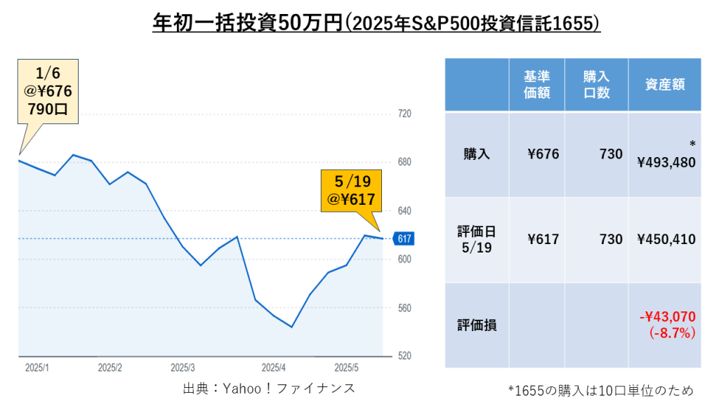 🔹年初に50万円を一括で投資した場合、株価が下落していく中で評価損が大きくなりました。5月19日時点では▲8.7%の損失となっています(S&P500投資信託1655を使用)。