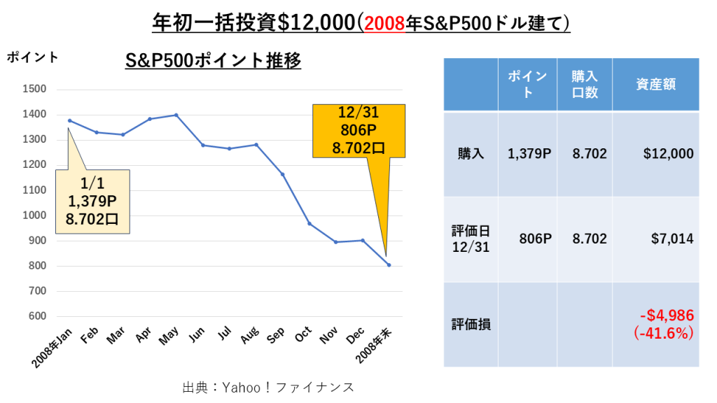 まず一括。年初がほぼ最高値に近いところから、その年の下げを丸々くらっています。評価損は何と-41.6%。これが有名な100年に一度の大暴落ですね。