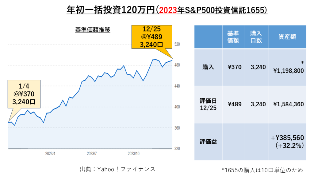 さらに円ベースの投資信託では+32%の大きな伸びを記録。もちろん一括ならこれをフルに享受できました。(S&P500投資信託1655を使用)