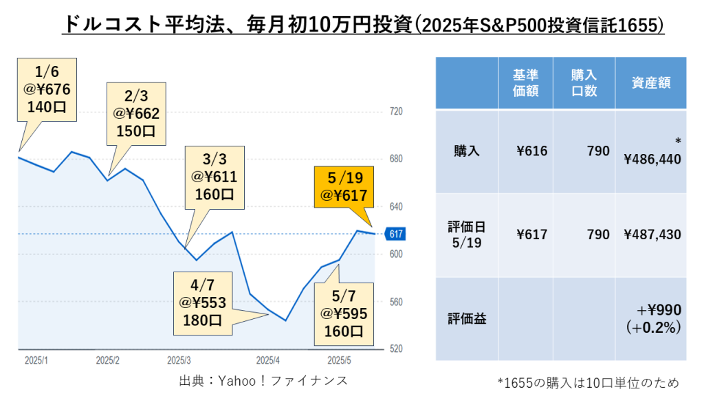 🔹毎月10万円ずつ投資したドルコスト平均法では、価格が下がった月に多くの口数を買えたため、平均取得価格が抑えられました。結果、微益ながらもプラス評価となっています(+0.2%)。