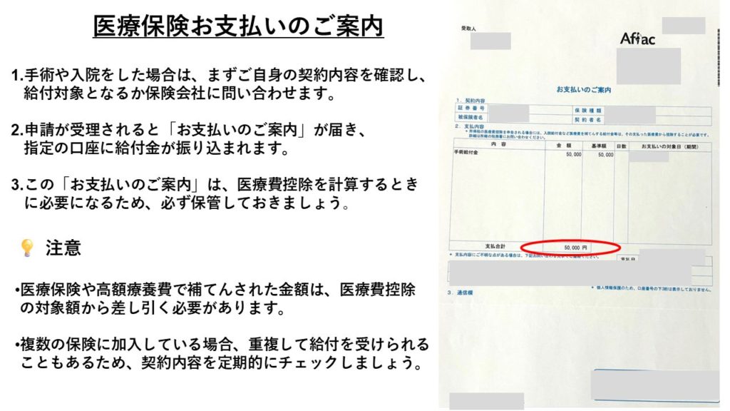 白内障手術など自費診療でも医療保険からお金が支払われる場合もありますのでそちらの支払い明細も忘れずに保管しておきます。