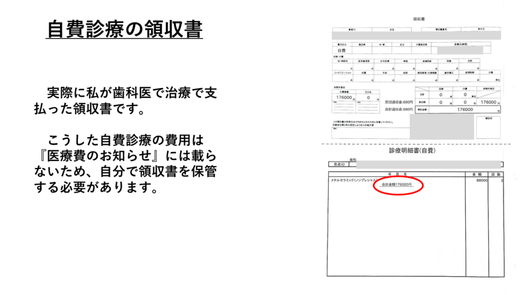 「医療費のお知らせ」に載らないのが自費診療です。必ず自分で領収書を保管しておきましょう。クリアファイルでまとめるのがシンプルでおすすめです。
