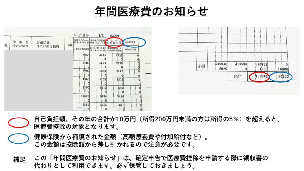 会社員の場合、翌年2~3月頃に「医療費のお知らせ」が送られてきます。これは病院や薬局で支払った保険診療分の一覧で、申告時に領収書の代わりとして利用できます。