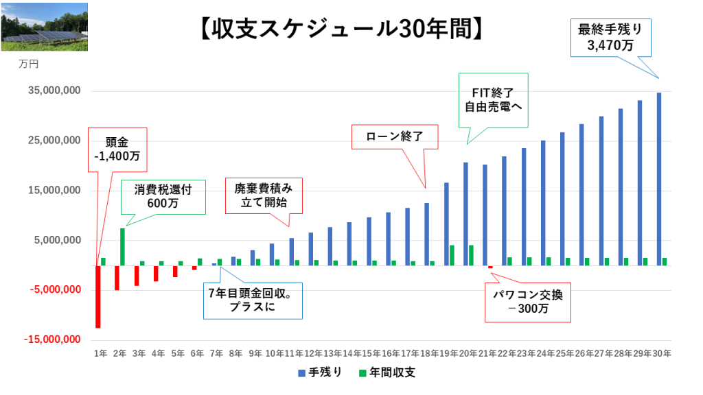 太陽光発電以外の経費や予期せぬ突発的な事故は入れていませんが、頭金は7年程度で回収。最終的には30年間で合計3,470万円、初期投資が約2.5倍程度と予測しています。(あくまで現時点での試算ですのでご了承ください)