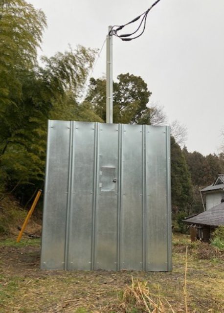 対策としては、まず柱に近寄らせないこと。そして銅線部分をセメントで固めて簡単には窃盗できないようにする事です。以下が引込柱とそこに設けたフェンスです。地元の業者さんにコンタクトして製作してもらいました。