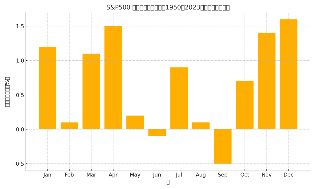 以下は 米国株式S&P500の1950年から2023年まで月別の平均リターンを表したグラフです。いわゆるアノマリーです。(Chat GPTで生成)