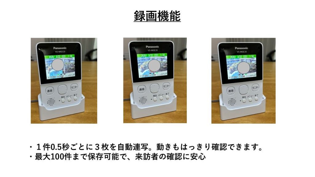 この機種の大きな特徴は「留守中の録画」。外出中でも誰が来たかを後から確認できるのはとても便利です。最大100件録画可能(1件0.5秒おきの3連続画像)。