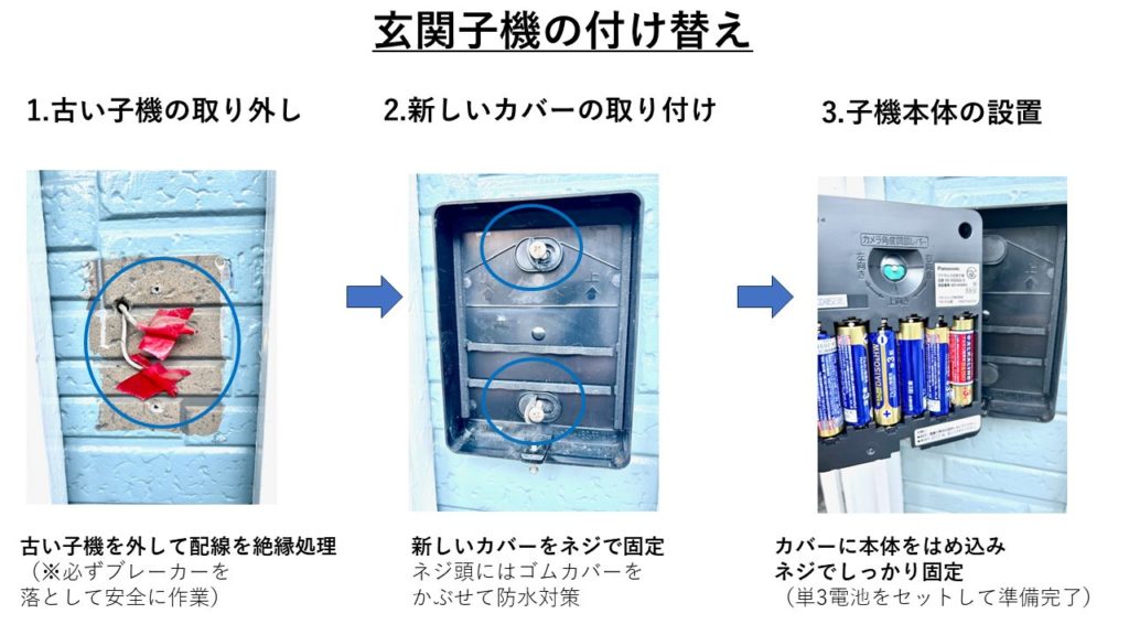玄関子機は単3電池6本で稼働し、映像・音声をワイヤレスで送信する仕組み。既存の古いドアホンの配線は取り外し、コネクタ部分をビニールテープで絶縁するだけでした。